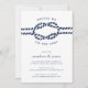 Nos dîners de répétitions de mariage chic côtier sont décorés dans un style nautique classique en bleu marine et blanc. "Avant de cravate le noeud" apparaît en haut, courbée autour d'une illustration de corde à noeud bleu marine. Personnalisez avec vos détails de souper de répétition sous une combinaison chic de lettres serif et sans serif. Idéal pour des dîners nautiques, de plage ou de répétition estivale. Les cartes retournent à un motif de corde nautique en boucle en blanc sur la marine.
