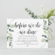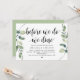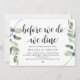 Carte d'invitation thématique Modern Rustic Greenery Eucalyptus,, Black Script (avec titre de carte : Avant de nous unir, nous dînons !). Elle est parfaite pour votre célébration de dîner de répétition de mariage, avant votre plus beau jour. Ajoutez vos détails dans la même police / lettrage noir.