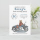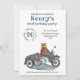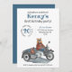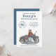 Un mignon petit ourson attend dans le sidecar de la moto de son père, prêt à l'aventure ! Les mots sur sidecar lisent "L'aventure attend". Cela fait une adorable invitation pour la fête d'anniversaire d'un garçon !
