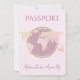 Invitation au Baby shower Passeport pour petite fille sur le thème du voyage avec arrière - plan rose pastel, illustration du globe orné d'or et détails personnalisables de l'événement.