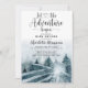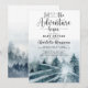 Invitation bébé shower avec des arbres de la forêt aquarelle et la phrase : que l'aventure commence thème. Couleurs gris-bleu doux éthérés. Nom en signature script. Forêt aquarelle bleu-vert.