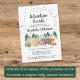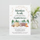 Invitation douce et rustique pour une baby shower avec une illustration adorable d'animaux de la forêt installés dans leur tente de camping dans les montagnes et la forêt, un overlay d'étoiles dorées et "L'Aventure Attend" et le nom de la future maman dans un script vert chasseur foncé. Personnalisez facilement les détails de la douche.