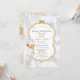 Beau petit garçon dans son costume de baptême et collier de croix d'or. Invitation arrière - plan est satin blanc avec un cadre parties scintillant or et argent et embellissement arc. Le dos est orné de motif de fleurs dorées et de ruban doré sur un arrière - plan satiné blanc.
