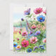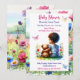 Invitations de douche pour bébé de fille. Petite petite fille afro-américaine mignonne avec un ours en peluche assis sur l'herbe entourée de papillons et de fleurs dans un style aquarelle. Les couleurs sur invitation sont rose, violet, vert, jaune et bleu.