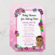 Invitations de douches pour bébé à thème rose et violet. Jolie petite fille à floral blanc dessinée à la main tenant un ours en peluche entouré de jolies fleurs aux couleurs vives. Ce petit bébé sucré a été dessiné avec une peau plus foncée pour représenter les bébés afro-américains, birmans ou hispaniques.
