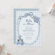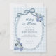 Celebrate the mom to be with this Baby in Bloom Dusty Blue Floral Boy Baby Shower Invitation. Designed with soft french blue florals, a sweet bow frame, and a vintage gingham background, this charming floral theme feels elegant and timeless. Perfect for a spring baby shower or garden celebration for a baby boy, this whimsical invitation is easy to personalize and print or send digitally.