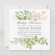 Une carte d'invitation élégante pour Baby-Shower avec un feuillage vert sauvage à l'aquarelle et des fleurs roses. Pour une personnalisation avancée de ce design, veuillez cliquer sur le bouton "Personnaliser" ci-dessus ! Des articles assortis sont également disponibles.