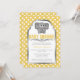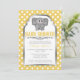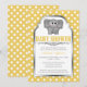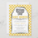 Invitations de Baby Shower jaunes et grises avec une adorable illustration d'un bébé éléphant affectueux sur un motif à pois jaune et blanc. Ce sont des invitations parfaites pour des baby showers sans distinction de sexe, quand le sexe du bébé va être une surprise, ou quand la couleur préférée de Maman-to-Be est jaune.
