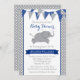Jolie invitation à la douche bébé bleu marine et gris éléphant. Cet invitation baby shower amusant est doté d'une bannière de brassage bleu foncé et gris, d'une petite illustration d'éléphant de bébé et de pois. Parfait pour un baby shower garçon.