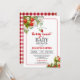 Invitations à thème pique-nique de fraises sucrées et estivales pour bébé douche. Doté de belles fraises et fleurs aquarelles avec un classique rouge et blanc à carreaux table de pique-nique "couvercle" au verso.