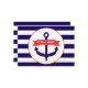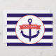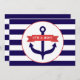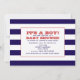 Une invitation à baby shower sur le thème de l'océan avec un arrière - plan rayé bleu marine et blanc devant et derrière. Sur le devant, on peut voir l'illustration d'une ancre bleue recouverte d'une bannière rouge disant "C'est un garçon !"