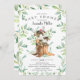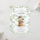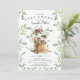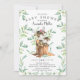 Jolie invitation baby shower avec l'orignal doux avec maman assise sur une souche d'arbre et encadrée de feuilles d'aquarelle verte naturelle sur un arrière - plan blanc. Retournez notre invitation pour voir une feuille verte assortie pour une touche spéciale.