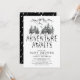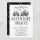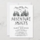 L'aventure attend les garçons invitation baby shower avec des montagnes et des arbres esquissés avec une police d'étoile dessinée à la main sur une invitation blanche. Retournez notre invitation de douche pour voir un dos noir coordonné avec des flèches tribales.