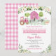 Cette invitation présente de mignons animaux de ferme aux accents floraux roses.