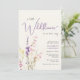 Une invitation élégante et fantaisiste de couleur taupe clair pour une baby shower pour fille, avec la phrase "une petite fleur sauvage est en route" écrite dans un mélange de typographie grise douce moderne et d'un script violet stylé, et un bouquet aquarelle inspiré de la bohème avec des petites fleurs sauvages violettes, roses et jaunes.