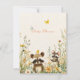 Belle invitation baby shower avec bébé Racoon, Souris aux oreilles roses debout dans un champ de fleurs. Les papillons et une coccinelle ajoutent du charme à cette mignonne invitation.