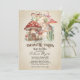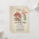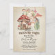 Cette invitation personnalisée présente un thème de baby shower au jardin enchanté. Le fond est un design de papier parchemin décoloré pour ressembler à un livre de contes de fées vintage. Une image d'une petite maison champignon et d'un chemin menant à un jardin de fées enchanté est représentée dans la partie supérieure. Diverses fleurs et champignons sont placés le long du chemin. Des lumières de fées délicates accentuent les parties supérieure et inférieure.