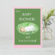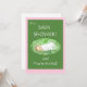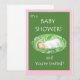 Une carte d'invitation Baby shower pour une nouvelle petite fille, avec un bébé endormi et des lettres blanches sur un arrière - plan vert foncé, bordé de rose.