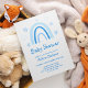 Faites de votre baby shower une fête avec notre invitation à Baby shower bleu arc-en-ciel moderne et tendance. Ce design simple et sophistiqué allie à merveille les teintes bleues douces et une touche minimaliste qui donne le ton parfait pour accueillir un bébé. L'écriture ludique crée une atmosphère charmante, ce qui en fait un choix approprié pour la future mère élégante. Offrez-vous une occasion joyeuse avec un soupçon de fantaisie car les accents d'arc-en-ciel d'aquarelle ajoutent une ambiance adorable et joyeuse à cette invitation unique. Pour les articles correspondants, visitez la collection de Baby showers Blue Modern Elegant Cute Nursery Decor.