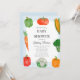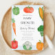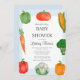 Un joli paysan garçon de marché baby shower invitation modèle. Le design présente des aquarelles peintes à la main sur un arrière - plan motif bleu en vichy.