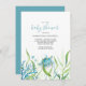 Cette invitation à baby shower blanc et bleu blanc et blanc fantaisie comporte les mots "Baby shower" mis dans une typographie stylée à la main avec détails de l'événement dans un gris charbon police serif classique sur un arrière - plan blanc immaculé avec un fond de fond de tortue marine, étoiles de mer, corail de mer et algues. La carte invitation revient à une couleur turquoise offerte. Une idée simple mais mignonne pour un thème de baby shower Under The Sea boy. Pour voir l'ensemble de la suite, visitez le www.zazzle.com/dotellabelle Unique aquarelle art et design de Victoria Grigaliunas de Do Tell A Belle sur Zazzle.