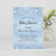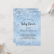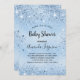 Pour un baby shower, célébrer un bébé garçon. Un arrière - plan faux métallique bleu clair. Décoré avec de la poussière de parties scintillant imitation. Modèles pour le nom de la mère à être et les détails de la fête. Le nom et le texte : Baby shower sont écrits avec un script de style écrit à la main