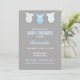 Invitation Baby shower mignonne dans un jeu de couleurs bleu et gris, avec une illustration de costumes de bébé dans une ligne de linge. Ce design est parfait pour une célébration de Baby shower de garçon.