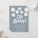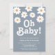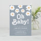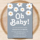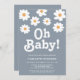 Prévoyez-vous le baby shower d'un garçon ? Cette mignonne invitation au baby shower est décorée de marguerites blanches et de typographie rétro élégante sur un arrière - plan bleu.