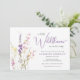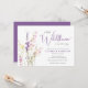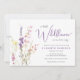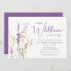 Une invitation fantaisiste à la douche pour petite fille avec "un petit fleur sauvage est en route" écrite dans un mélange de typographie gris moderne et un élégant script violet, et un bouquet d'aquarelle d'inspiration boho de fleurs sauvages mauve, rose et jaune.