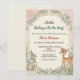 Charmant baby shower boisé invitation avec un cerf, lapin et oiseau doux aux accents de verdure fleurie et un arrière - plan pastel doux. Parfait pour les baby showers rustiques, d'inspiration nature ou non sexiste.