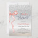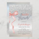 Une jolie invitation au baby shower présente un arc rose sur un arrière - plan bokeh parties scintillant argent. Ces invitations de douches pour bébés sont facilement customisées pour votre événement en ajoutant simplement vos détails.