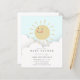 Thème de baby shower neutre avec illustration d'un soleil avec visage souriant sur un ciel bleu avec nuages au fond et texte gris.