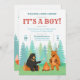Ce design rustique est parfait pour un baby shower extérieur à thème camping. Le design moderne comprend des animaux en bois autour du feu de camp. Personnalisable .