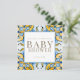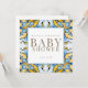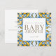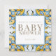 Invitation Baby shower bleu et jaune. Carré. Texte en or.