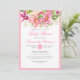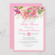 Invitation baby shower chic et joyeuse avec un riche bouquet de fleurs, bourgeons, brindilles et feuilles. Rose, corail, vert, orange, violet. Lettres roses chaudes. Combinaison de polices élégante, script et serif classique. Arrière - plan rose. Festif, chic, élégant, classe. Idéal pour les baby showers fleuris ou roses. Oeuvre à base de carte florale vintage du 19ème siècle.