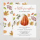 Des invitations Rustiques à la douche bébé d'automne avec un arrière - plan blanc simple, de mignonnes feuilles de chute d'aquarelle, un citrouille et un modèle de baby shower moderne qui est facile à customiser.