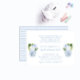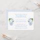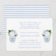 Le devant de ce design d'invitation de baby shower classique présente des florales aquarelles bleues et blanches dans un vase jarres au gingembre. Le verso de l'invitation présente des rayures seersucker bleu clair et blanc. Vous pouvez changer le bleu en n'importe quelle couleur que vous aimez en entrant dans l'outil de conception (cliquez ou appuyez pour personnaliser davantage) et en changeant la couleur de fond.