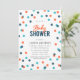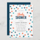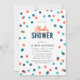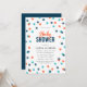 Invitation baby shower Confetti avec confettis en bleu, bleu foncé et orange. L'invitation a un arrière - plan de couleur bleu foncé à l'arrière. Personnalisez cette invitation avec vos détails en remplaçant le texte de l'espace réservé. Pour plus d'options comme changer la police, la taille/la couleur du texte ou l'espacement entre les lettres, cliquez sur le bouton "Personnaliser". *Veuillez noter que le filigrane Zazzle qui apparaît dans l'aperçu du zoom n'apparaîtra PAS sur le produit imprimé final. © Bois de rose et agrumes