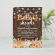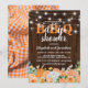 Invitation de baby shower country automnal barbecue avec un fond en bois rustique, des guirlandes de lumières de jardin, des fleurs aquarelles élégantes orange et blanches d'automne, et un modèle de célébration de baby shower de couple facile à personnaliser.