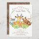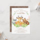 Adorable invitation de baby shower avec un cerf, un ours, un hibou, un renard et un raton laveur encadrés d'une délicate vigne à feuilles de fleurs roses posée sur un arrière - plan rustique en bois pour un baby shower neutre pour les hommes. Retournez notre invitation pour voir un retour de coordination pour une touche spéciale supplémentaire.