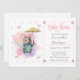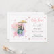 Cette adorable invitation au baby shower pastel à l'aquarelle présente une souris douce à la recherche d'abri sous un petit parapluie.