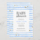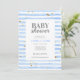 Invitation Baby shower tendance et moderne avec des rayures d'aquarelle bleu bébé, plaquettes d'or et retour page correspondante. © Mini Moi Prints