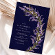 Une aquarelle classique élégante de lavande fleurie chic avec des branches et des fleurs de tiges botaniques de lavande violette, feuillage vert et marron et calligraphie élégante sur bleu foncé.