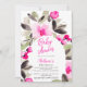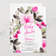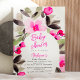 Annoncez votre prochain Baby shower avec nos invitations peintes à la main, avec de jolies et charmantes fleurs rose vif et des feuilles verdoyants en aquarelle avec un script moderne cool brossé. Le script de brosse moderne ajoute une touche d'élégance à ces invitations uniques qui sont parfaites pour toute célébration à thème boho., parfait pour les extérieurs et les baby showers de jardin. Avec un cadre fleuri.