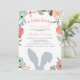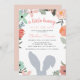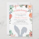 Les invitations à la douche pour bébé sur le thème du printemps pour votre petit lapin sur le chemin comprennent une bordure florale boho et une silhouette d'oreilles lapin grise.