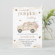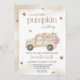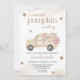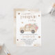 Invitation baby shower d'automne avec un design rustique incluant un pick-up camion, citrouilles et feuilles d'automne.