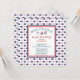 Invitation baby shower nautique avec une montre d'ancre, voilier et roue de capitaine dans un cadre rouge et bleu sur arrière - plan de baleine bleue. Retournez notre invitation de baby shower nautique mignon et coloré pour voir un retour assorti pour une touche spéciale supplémentaire.