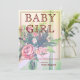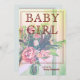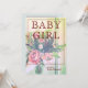 Une invitation pour un baby shower bébé fille avec des fleurs à l'avant et des informations sur l'événement à l'arrière.