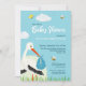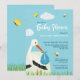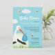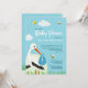 Joli garçon personnalisable baby shower invitation modèle avec une cigogne dessinée à la main avec abeilles et papillon sur une prairie et bleu ciel arrière - plan. La cigogne bleue fait la livraison spéciale d'un bébé garçon. Célébrez l'arrivée imminente du nouveau bébé garçon avec cette carte d'invitation mignonne pour bébé sprinkle de cigogne. Personnalisez l'invitation avec votre texte et vos informations.
