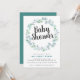 Une jolie et délicate invitation au baby shower avec une couronne d'aquarelle fleurie dans le bleu et le vert doux. L'expression "baby shower" est en police gris foncé de style moderne, invité d'honneur en turquoise, et les détails de l'événement en gris au bas de l'invitation. L'arrière de l'invitation est en turquoise solide.